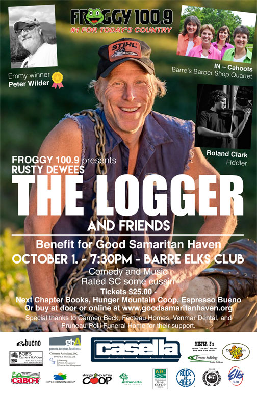 oct-1-barre-elks-final-web[BARRE, VT – October 5, 2016] Rusty Dewees: The Logger! will perform a benefit show for Good Samaritan Haven homeless shelter on Saturday, October 1st at the Barre Elks Club. Enjoy a fun-filled night of comedy and music, while helping end homelessness in Central Vermont.